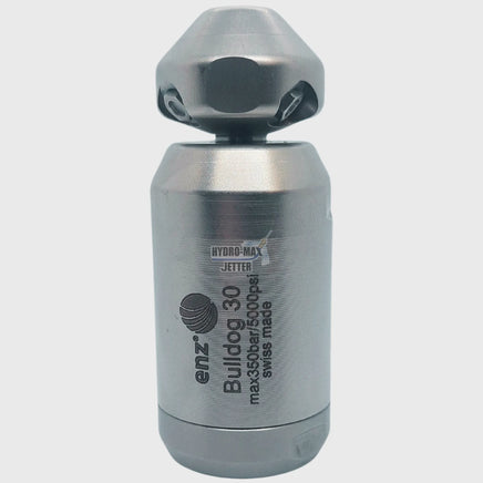 The enz® Bulldog® 30 Rotating Nozzle Delivers Outstanding Results in Challenging Pipes with Deposits, Fat/Grease, and Roots. It Features a Slow Rotation Speed, Extending Jet Time. 1/4" has 1-Forward and 4-Rear Jets. 3/8" has 1-Forward and 6-Rear Jets. The Jets are Combined with Controlled Rotation and an Integrated Oil-free Braking System, Ensure Low Wear and Tear and Precise Rotation Control. Compatible with Both Fresh and Recycled Water, the enz® Bulldog® Nozzle is Exceptionally Easy to Handle.